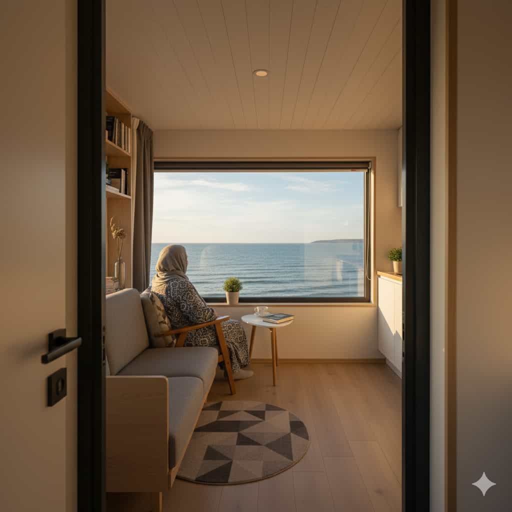 “زندگی در این خانه کوچک، چنین آرامشی را برای من به ارمغان آورده است. پنجره از کف تا سقف که منظره بیپایانی از دریا را ارائه میدهد، ویژگی مورد علاقه من است و هر صبح را به یک شادی تبدیل میکند.
